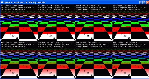 Как можно заметить, в зависимости от используемой таблицы максимально качественный Level 8 может быть заменён на Level 1 либо Level 2 в режиме Performance и на Level 2 либо на Level 4 в режиме Balanced. Не зная первоначально критерия выборки индекса таблицы, мы предположили, что в его качестве используется индекс текстурной стадии и программисты из NVIDIA занялись откровенным надувательством, элементарно занижая степень анизотропии на первой и второй текстурных стадиях. Для проверки этой гипотезы мы специально разработали тестовое приложение OpenGL anisotropic filtering quality test v1.0 (160 Kb), отображающее тестовую сцену, состоящую из одной единственной поверхности, на которую в режиме мультитекстурирования накладывается до четырёх текстур за один проход: