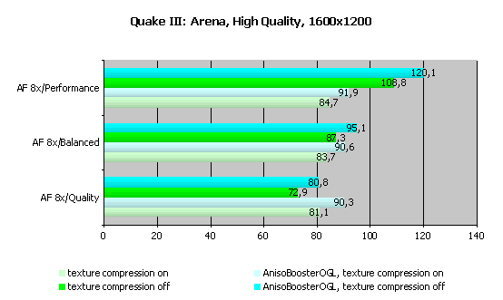 Обратите внимание на практически идентичные результаты между режимами Intellisample, полученные с включенной компрессией текстур (81,1 FPS в режиме Quality против 84,7 в режиме Performance, разница между ними составляет всего 4.5%), и почти пятидесятипроцентную разницу между ними (72,9 FPS в режиме Quality против 108,8 FPS в режиме Performance) при её отключении. Более того, использование скрипта AnisoBoosterOGL даёт ещё почти десятипроцентную прибавку в производительности. Остаётся только счастливо прослезиться, глянув на максимально возможные 120 FPS и вспомнив 50 FPS, которые мы не так давно получали в тех же самых условиях тестирования до появления в драйвере алгоритмов отброса полигонов и алгоритмов анализа чёткости текстур. Понадеемся на то, что алгоритмы Intellisample будут и далее развиваться такими же семимильными шагами и при этом качество изображения не будет страдать очень сильно.