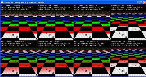 Кроме этого, наше тестовое приложение позволяет выбрать текущую текстурную стадию, с которой будет ассоциирована однородная текстура белого цвета с цветными mipmap уровнями (чередование белого, красного, зелёного и синего цветов). Совокупность возможности выбора текущей стадии, использующей текстуру с разноцветными mipmap уровнями, и возможность одновременного отображения одной и той же тестовой сцены с различными комбинациями билинейной (изотропной), анизотропной и трилинейной фильтрации должны были неизбежно выявить снижение степени анизотропии на разных текстурных стадиях, если бы оно, конечно, имело место.