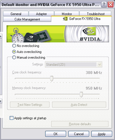Эту идею NVIDIA, очевидно, позаимствовала у ATI и известной там под маркой Overdrive технологии автоматического контроля частоты графического процессора в зависимости от температуры. Собственно, Overdrive мы упомянули не случайно. Разгон средствами этой технологии в драйверах Catalyst, к сожалению, оставляет желать лучшего и вряд ли получит широкое распространение, поскольку на большинстве систем с топовым видеоадаптером RADEON 9800XT прирост при её активизации просто мизерный и составляет всего 7MHz по частоте ядра, поэтому нам весьма интересно, что же противопоставит им в этом плане конкурент. Давайте посмотрим, как подошли к реализации этого вопроса программисты NVIDIA и удалось ли им сделать автоматический разгон более эффективным.