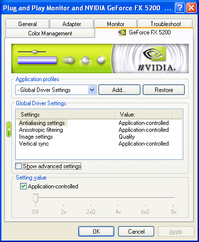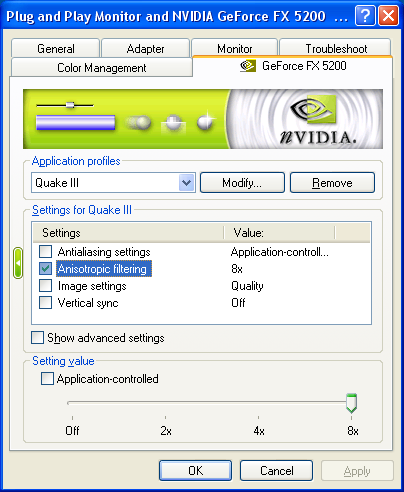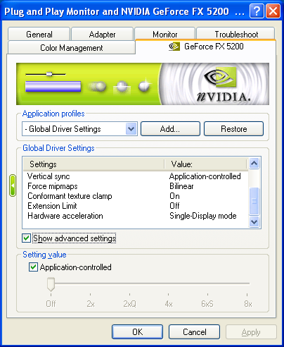 Флажки, появившиеся рядом с каждой из опций, позволяют включать её в выбранный профиль, то есть делать эту настройку персональной для всех исполняемых приложений, ассоциированных с данным профилем. Если же флажок не установлен, то драйвер использует глобальное общее значение этой настройки. Очень удобный подход, позволяющий, к примеру, сделать настройки анизотропной фильтрации персональными для нужного нам приложения, а настройки полноэкранного сглаживания глобальными.