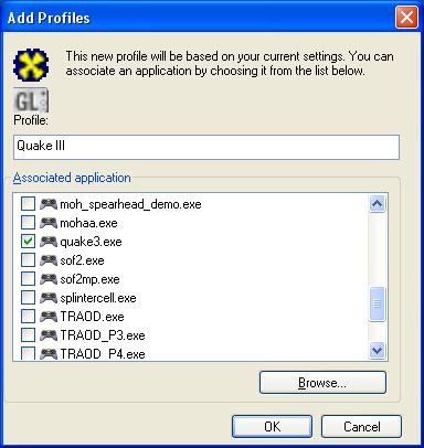 Отметим, что при создании профиля Вы можете ассоциировать с ним сразу несколько приложений, отметив их в вышеприведённом списке. Полезно это, в первую очередь, для игр, имеющих несколько независимых исполняемых файлов (например, присутствующая в списке Soldier of Fortune II имеет сингл и мультиплеер версии, размещённые, соответственно, в файлах sof.exe и sof2mp.exe).