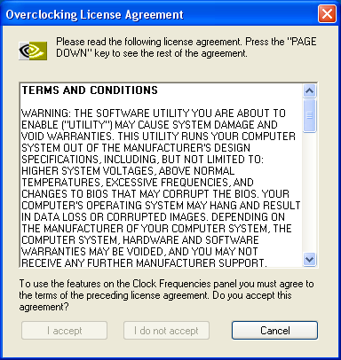 Нельзя также обойти вниманием и усовершенствованную встроенную утилиту разгона (напоминаем, что за её включение также отвечает первый бит ключа CoolBits). В первую очередь бросается в глаза появившееся в ForceWare 2.0 Overclocking License Agreement, которое нас вынуждают принять при активизации разгона: