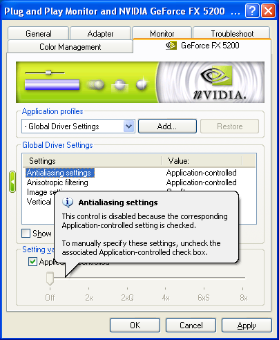 До последнего времени унифицированными в панели драйверов NVIDIA были лишь настройки полноэкранного сглаживания и анизотропной фильтрации, а также ползунок качества фильтрации, именуемый в разных версиях драйверов как Image quality либо как Intellisample settings (читателям, не знакомым с аспектами внутренней реализации алгоритмов повышения скорости анизотропной фильтрации, регулируемых данным ползунком, напомним, что мы уже касались этой темы ранее). В новом поколении драйверов к списку упомянутых выше унифицированных настроек добавился и ползунок настройки вертикальной синхронизации, позволяющий форсировать либо, наоборот, отключать её во всех 3D приложениях. Видимо для того, чтобы иметь возможность предоставления пользователю неограниченного набора унифицированных настроек на одной закладке, выбор нужной настройки теперь производится из списка Driver settings, а нужное значение настройки выбирается ниже в поле Setting value. Весьма удобно. Стоит также отметить и ещё одно удобное нововведение: всплывающую подсказку, объясняющую, почему та или иная настройка неактивна в данный момент времени. Стоит остановить курсор мышки на нужной опции, и панель настроек объяснит, почему она заблокирована: