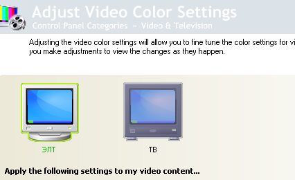 Adjust Television Color Settings Нечто подобное предыдущему пункту, но предназначенное для регулировки яркости, контрастности и прочих настроек для картинки, выводимой на ТВ выход. Тут уже нет такого широкого набора настроек, но это и не нужно, ведь и у самого ТВ приемника они должны быть в наличии.