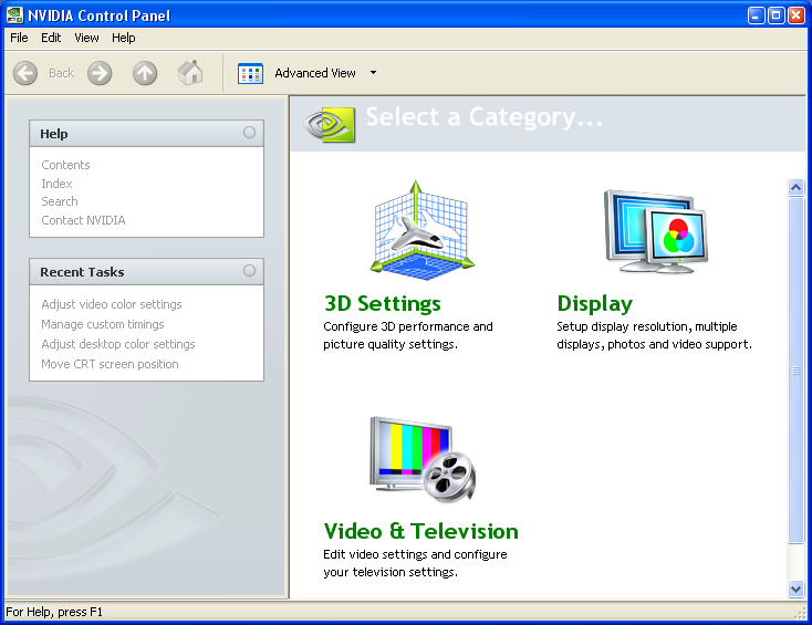 Переходим к самому важному — категориям. То, что вы видите на основной области задач: 3D Settings, Display, Video & Television — это все так называемые категории, собранные по определенным признакам наборы параметров и настроек. Значки для каждой категории, установленной в операционной системе, будут добавляться на главную страницу основной области задач по мере их установки, например, когда вы установите nTune, там появится соответствующий значок. Список категорий на этой странице зависит от конкретной системы, например, категория Mobile не будет доступной на настольных системах, а Workstation появится только на компьютерах с установленными видеокартами серии Quadro FX.