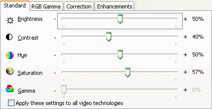 На этой странице расположено множество настроек видеоданных, выводимых на оверлеи и средствами VMR9: яркость, контрастность, гамма (в том числе поканальная), коррекция цветовой температуры, настройки постобработки: шумопонижение и увеличение четкости (sharpening) видеоданных. Два последних пункта и коррекция цветовой температуры впервые появились в ForceWare 90, и они действительно неплохо работают.