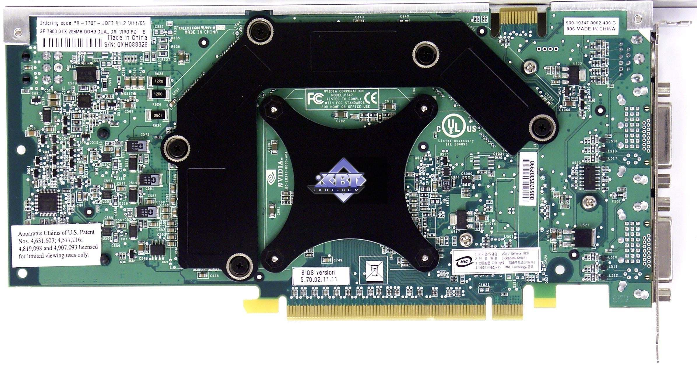 Очевидно, что перед нами все тот же reference (как и все GeForce 7800 GTX), лишь брекет установлен особый (с серийным номером, чтобы его было видно через окно в коробке). Обе карты совершенно идентичны и отличаются лишь частотами. Но по коду, указанному на PCB, можно узнать, какого типа карта: UDF7 - это обычная, UDE7 - Extreme edition, UDD7 - XXX Edition