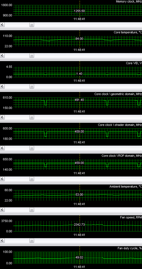 Я еще раз подчеркну, что карта XXX Edition при штатной системе охлаждения работает на повышенных частотах, причем, реально они выше, чем декларируется, ведь известно, что по умолчанию шаг увеличения частот на ядре составляет 27 МГц, и поэтому 450 МГц просто быть не может, реально - 459 МГц и 491 МГц на геометрическом блоке.