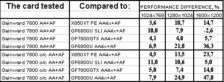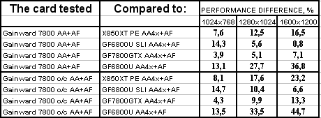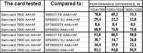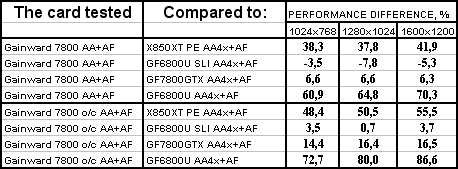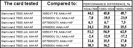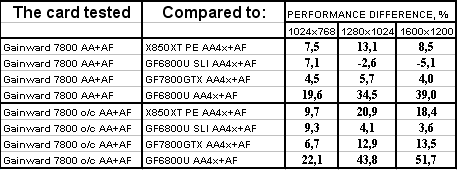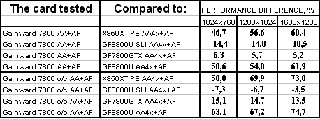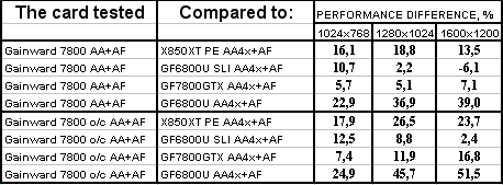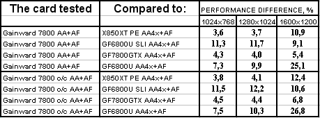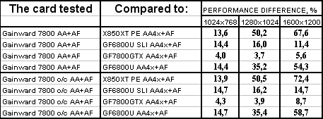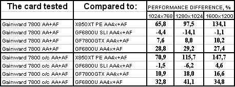 Интересно отметить, что карта от Gainward даже на своих штатных частотах почти везде обошла 6800 Ultra SLI. Не говоря уж о разгоне. Победа над конкурентами (условными, конечно!) впечатляет.