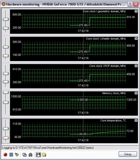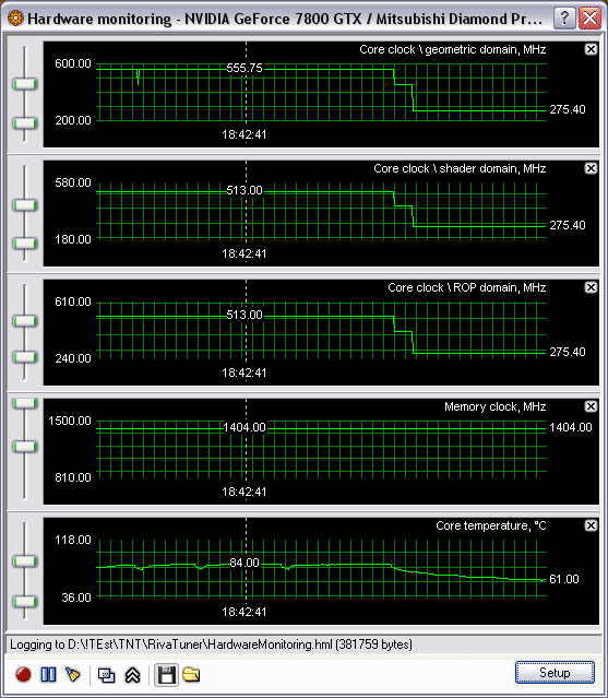 Итак, разгон. Полагаю, что нет нужды объяснять еще раз, что устанавливать частоту работы выше 513 МГц нет смысла, поэтому ее мы и выбрали, и вот какие температуры работы ядра получили (дополнительное охлаждение карты НЕ ИСПОЛЬЗОВАЛОСЬ!):