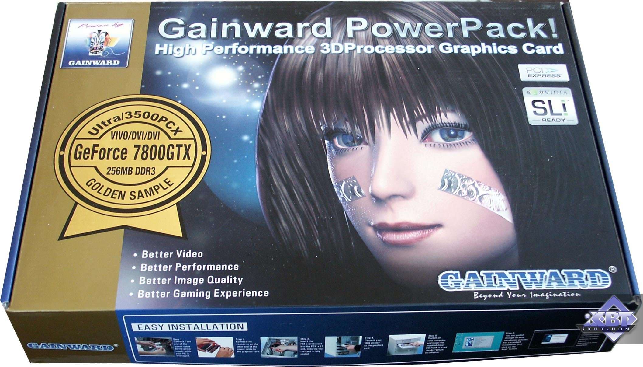 Итак, вернемся к GS. Несмотря на все передряги, линейка осталась. И более того, на примере GeForce 7800 GTX, уже пошли дальше: повышенные частоты прошиты прямо в BIOS, то есть устанавливать ExperTool вовсе необязательно. Одно по-прежнему огорчает (хотя московские сотрудники Gainward уже рыдают при моих 1000-кратно повторенных словах): линейку Golden Sample все же надо было выделить или цветом PCB (не зря же «Золотой образец»!), или особыми упаковкой и комплектом поставки. Но прилепить на карту стикер GS и на коробке (которая не менялась уже сколько лет!) повесить соответствующую наклейку — этого крайне мало для того, чтобы пользователь (особенно неопытный) смог по достоинству выделить эту серию из прочих.