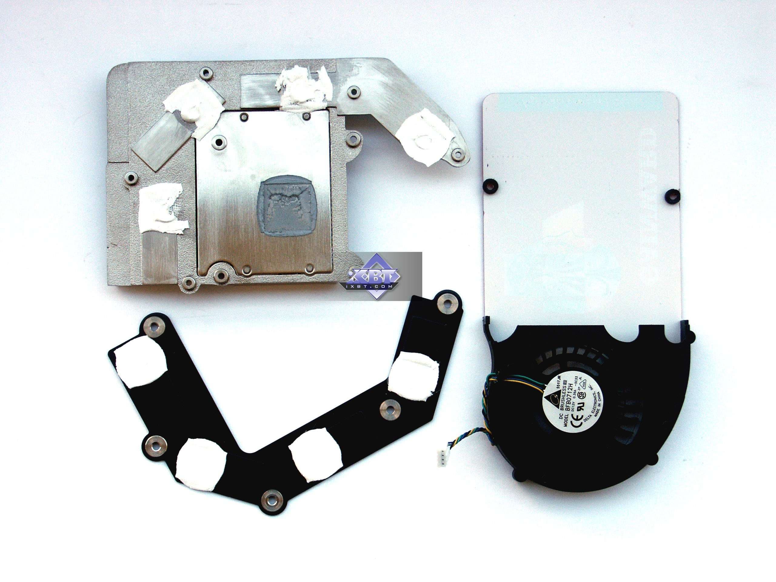 Система охлаждения была тщательно изучена в базовом материале по G70, я лишь напомню, что центральный радиатор с помощью тепловой трубки совмещен с радиатором, охлаждающим память. Далее: устройство в целом очень узкое, однослотовое, что не может не радовать (устали уже от этих громоздких ускорителей). Микросхемы памяти с оборотной стороны охлаждаются узкой пластиной. Кулер в целом очень даже нешумный, только на первых секундах после запуска можно слышать небольшой шум от вращающейся на быстрых оборотах турбины. Шум можно оценить на этом ролике (1.5MB, WMV) (обратите внимание, что турбина запускается не сразу после включения компьютера). | ![]() |