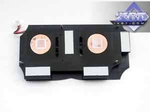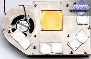 Система охлаждения была тщательно изучена в базовом материале по G70, я лишь напомню, что центральный радиатор с помощью тепловой трубки совмещен с радиатором, охлаждающим память. Далее: устройство в целом очень узкое, однослотовое, что не может не радовать. Кулер в целом очень даже тихий, только на первых секундах после запуска можно слышать небольшой шум от вращающейся на быстрых оборотах турбины. Шум можно оценить на этом ролике (1.5MB, WMV) Относительно кулера от 7800 GTX данная модель отличается уменьшенной длиной радиатора. В месте соприкосновения с кристаллом ядра установлена медная пластина. | ![]() |