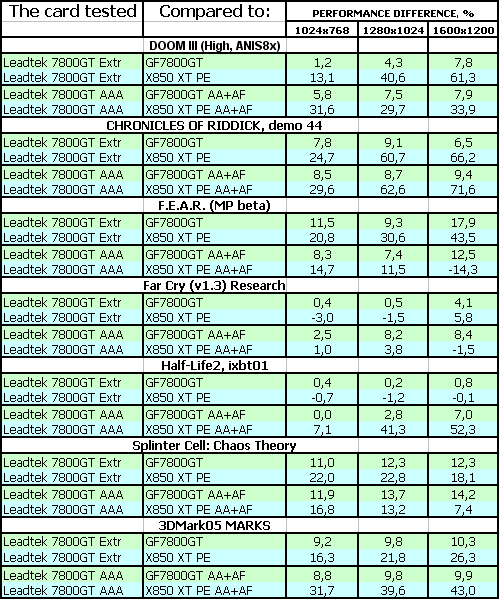 Проценты соотношений скоростей наглядно показывают, что новинка в лице 7800GT от Leadtek очень даже выгодна. При своей цене около 500 долларов она затмевает предыдущего лидера 3D-графики X850XT PE в большинстве тестов. Я уж не говорю о том, что 7800GT обладает всеми последними новациями в области трехмерных технологий (DirectX 9.0c в полную силу).