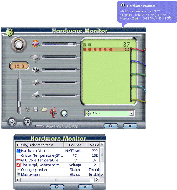 Как известно, Leadtek со своими картами поставляет их фирменную утилиту WinFox, которая не только умеет разгонять карты, но и обслуживать мониторинг состояния. Интересно отметить, что из всего набора того, что можно увидеть, на 7800GT не работает ничего, кроме температуры ядра. Утилита показывает архитектуру ядра, и… в ней точно такая же ошибка, что была в бета-версии RivaTuner — где показывается тип памяти не DDR3, а SDR. Что-то мне подсказывает, что это неслучайное совпадение, а программисты Leadtek явно использовали RT в своих целях.