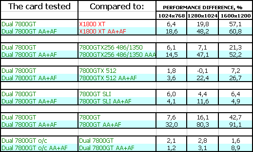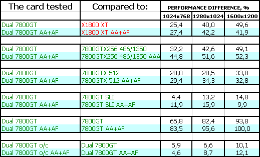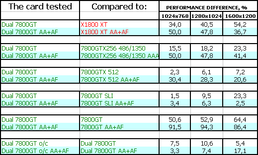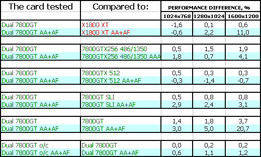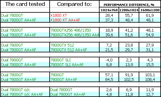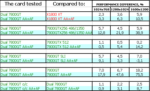 В данном тесте все должно быть как в математике: четко и по правилам. Так оно и есть: все скорости в прямом соответствии с характеристиками карт, все приросты адекватны. ASUS Dual 7800GT вышел в лидеры. Однако не забываем, что самые большие превосходства над соперниками (кроме одиночного 7800GT) не выше 55-60%, то есть примерно в 1.5 раза. Но цена выше отнюдь не в 1.5 раза.