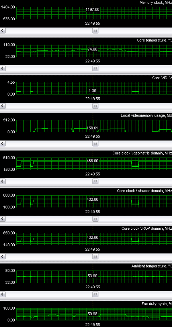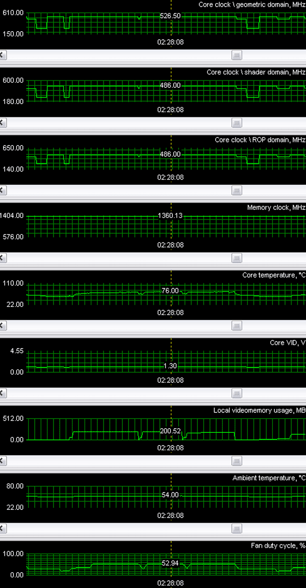 А теперь о разгоне. Как видно из представленного графика мониторинга, карта смогла работать на частотах 486/1360 МГц. Как мы видим, разгон очень приличный (учитывая, что вообще-то номинал 400/1000 Мгц)! И стоит отметить, что система охлаждения также надежно обеспечивает работоспособность и при таких частотах. Нагрев даже не увеличился!