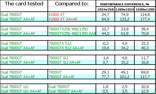 В данном случае, как и в ситуации с Far Cry, игра стала относительно легкой для мощных ускорителей, и даже АА+АФ не помогают избавиться от зависимости от CPU и системных ресурсов. Поэтому проценты разностей в скоростях невелики. Однако выводы все те же: лидером является Dual 7800GT.