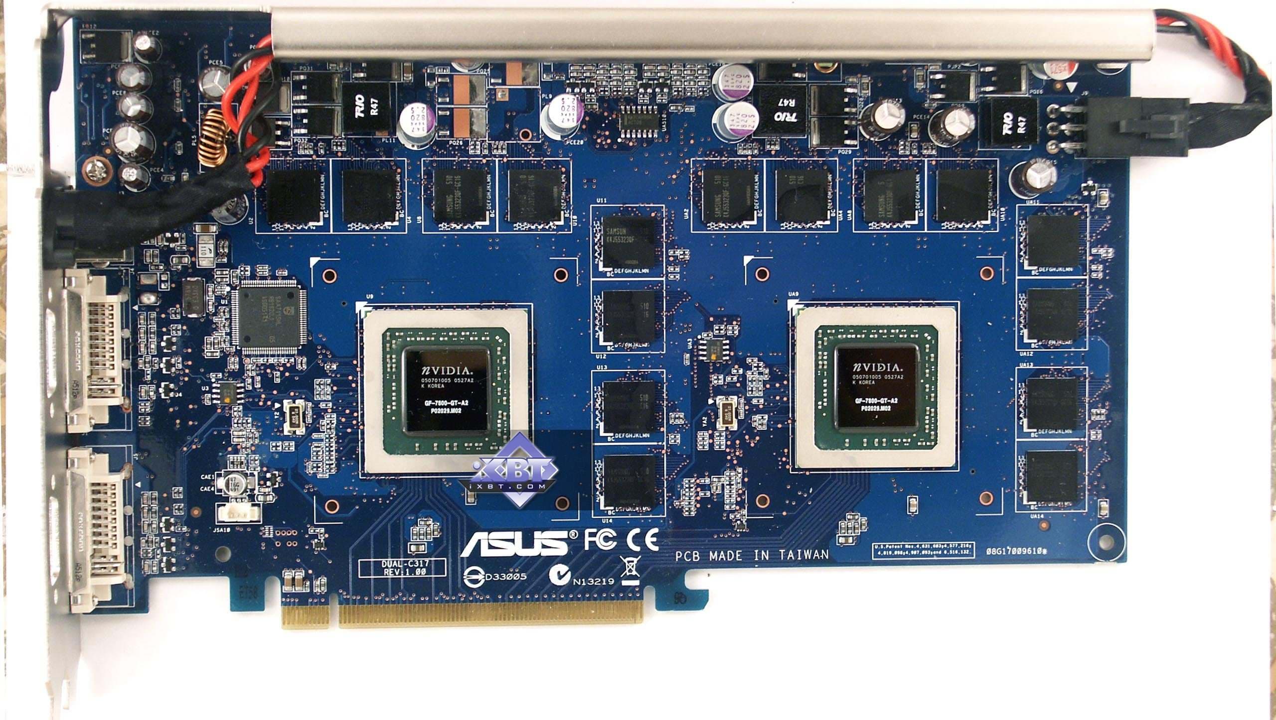 Понятно, что сравнение с одиночной GeForce 7800GT было лишь номинальным, PCB совершенна другая. Обратим внимание на то, что в первом выпуске двухпроцессорной карты (Dual 6800GT) компания ASUS просто соединила две карты на одном куске текстолита, разместив их по диагонали, чтобы хватило места под общий блок питания. В результате чего получилась громадина, не умещающаяся в большинство корпусов, к тому же полно пустых мест (очень нерациональное размещение компонентов). Очевидно, что разработка того продукта велась очень быстро и без продуманного и более дорогостоящего подхода по рационализации размещения компонентов при условии стабильности работы карты на заданных частотах.