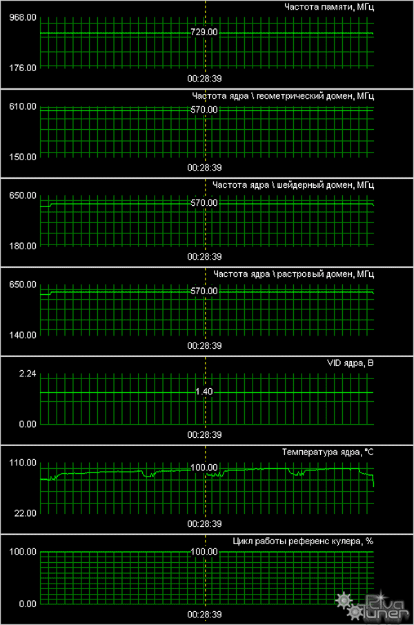 Нагрев карты по ядру - 100 градусов!!! Тестирование проводилось с помощью 3DMark06 в закрытом корпусе Chieftec, оборудованном стандартной продувкой (по 1 вентилятору на вдув и выдув). То есть, все эти надежды на бесшумность работы карты – лопнули, как мыльный пузырь. Да, я понимаю, что сама карта может работать при таком нагреве, и ей, может, ничего не сделается, но окружающие акселератор платы? Они могут перегреться, я молчу о поднимающейся от карты к процессору жаре. Меня сильно покоробили эти результаты. Повышенные частоты? Да нет, снижение до штатного уровня дало, может, пару градусов снижения температуры. Так что, очень неприятно.