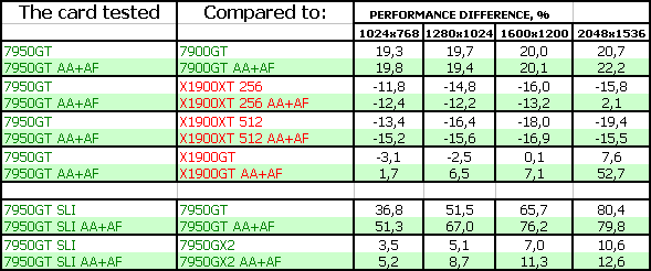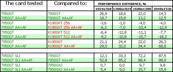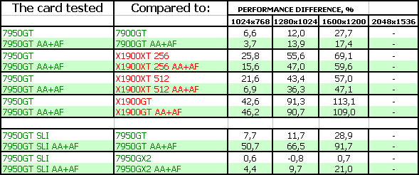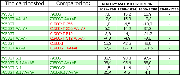 Также очень тяжело оценивать 7950 GT SLI, поскольку одиночных карт ценой в 600 долларов скоро не станет (до выхода G80). Даже стоимость 7950 GX2 уже стремится вниз, и должна вскоре соответствовать уровню в 500 долларов. Но, тем не менее, анализ производительности показал, что данный тандем, разумеется, при обещанных ценах, (реально-то будет дороже на первых порах) неплохо выступает даже против 7950 GX2. Но нельзя забывать, что нужна материнская плата с поддержкой SLI, и приличный блок питания.
