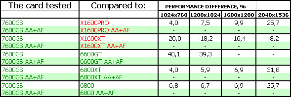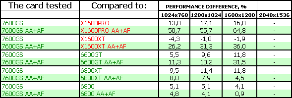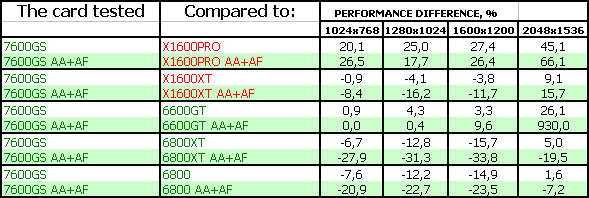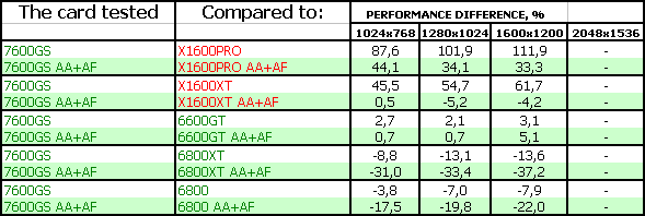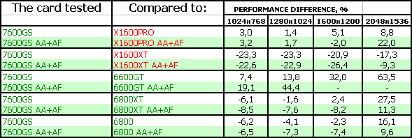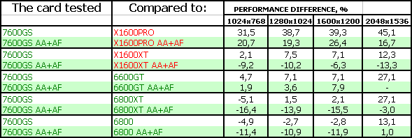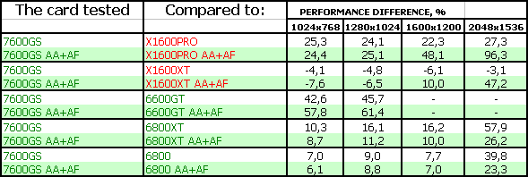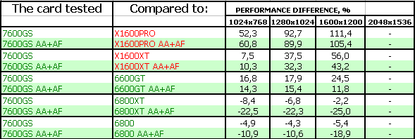 Учитывая играбельность и приемлемость в данном тесте режимов с АА+АФ, мы можем также констатировать успех 7600 GS, где карта опережает обоих соперников.