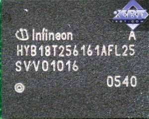 | Карта имеет 256 МБ памяти DDR2 SDRAM, размещенной в 8-ми микросхемах на лицевой стороне PCB. Микросхемы памяти Infineon (DDR2). Время выборки у микросхем памяти 2.5ns, что соответствует частоте работы 400 (800) МГц. | ![]() |