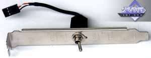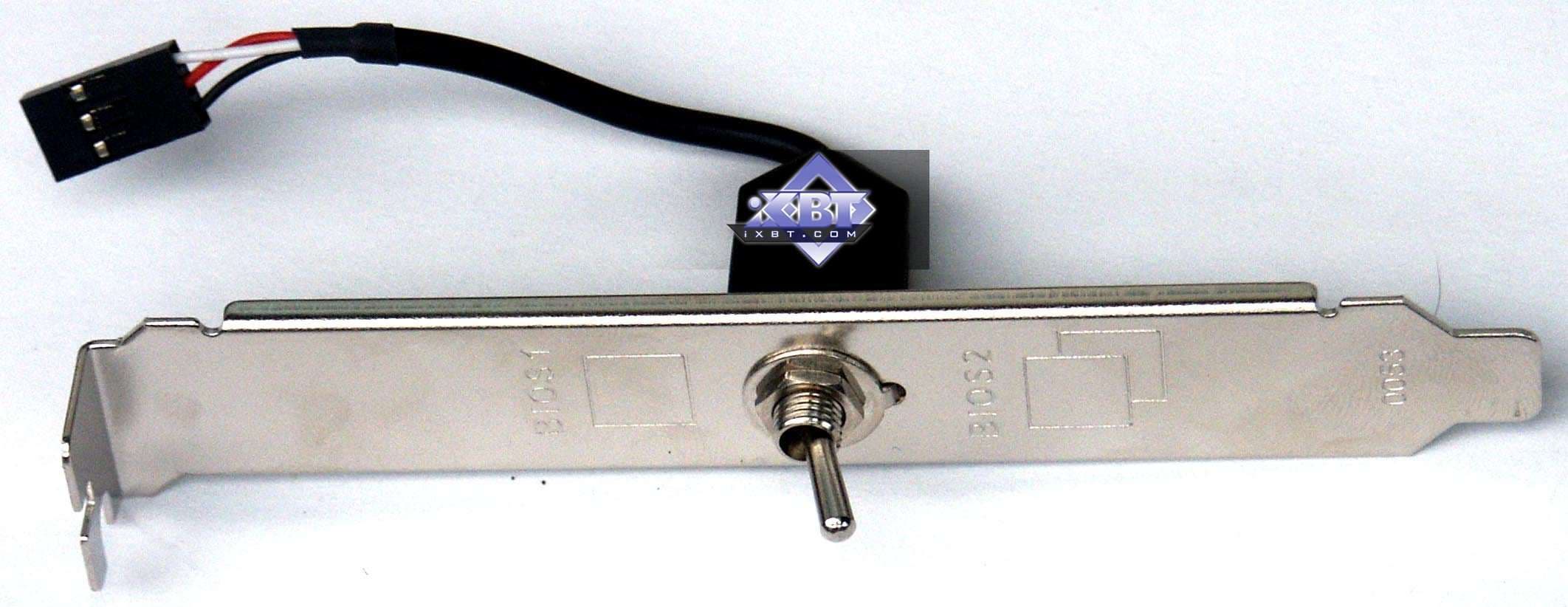 Мы видим, что дизайн у изделия свой собственный, и он предусматривает наличие трех перемычек джамперов. А также в комплект входит брэкет с переключателем. Дело в том, что набор джамперов с синей перемычкой переключает работу карты с одного BIOS на второй. Да-да, эта плата имеет две микросхемы BIOS для надежной работы в случае попыток перепрошивания новых версий BIOS. И можно таким путем регулировать запуск платы с одной копии BIOS или с другой. Или перемычкой на карте, или переключателем на брэкете.
