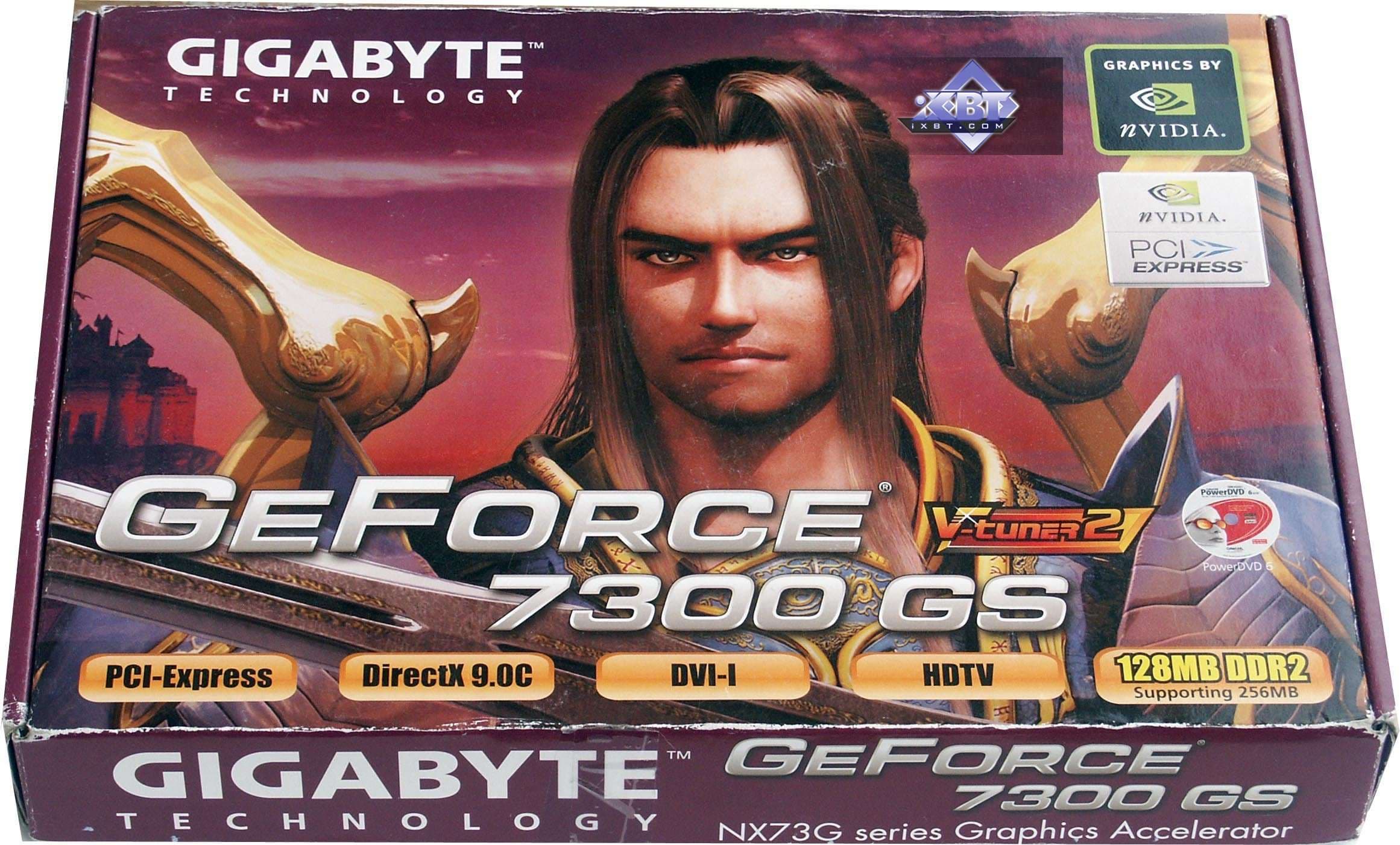 - Gigabyte GeForce 7300 GS 256MB PCI-E — рядовой низкобюджетный ускоритель. Стоит отметить повышенную частоту работы памяти относительно номинала, хотя для такого рода видеокарт это особой роли не играет. Положительный момент — бесшумность из-за отсутствия вентилятора. Сама карта низкопрофильная, но непонятно зачем водруженная на нее «рама» делает ее привычной высоты. Еще раз отмечу, что 7300GS и RADEON X1300 примерно равнозначны по скоростным параметрам, поэтому следует смотреть на цены.