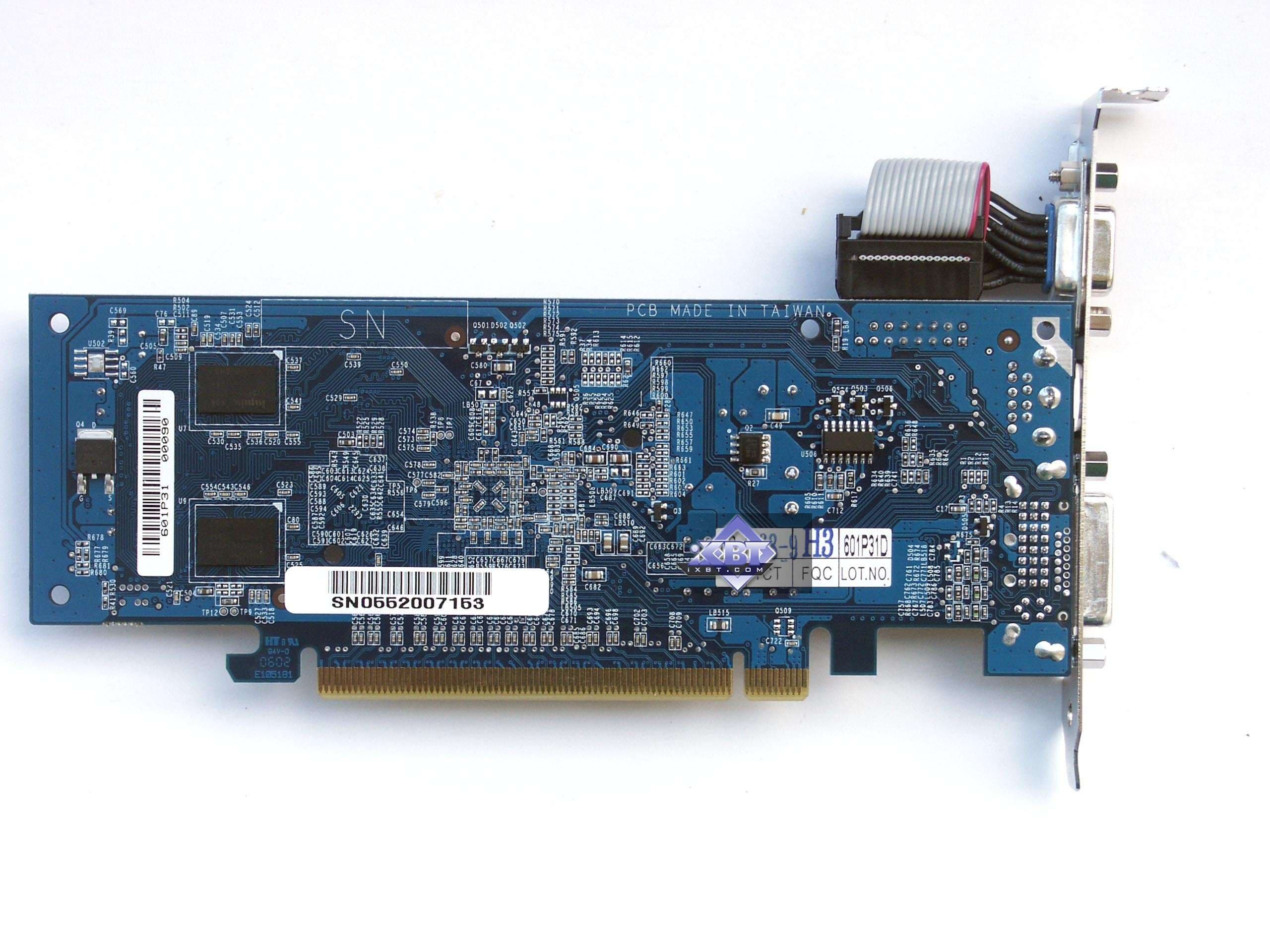 | Карта имеет 256 МБ памяти GDDR2 SDRAM, размещенной в 8-ми микросхемах на лицевой стороне PCB. Микросхемы памяти Hynix (GDDR2). Время выборки у микросхем памяти 2.8ns, что соответствует частоте работы 350 (700) МГц. | ![]() |