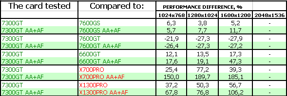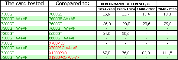 Почему не назвали ЭТО как 7600 LE или еще как-нибудь, например, XT (как любили некогда в NVIDIA) — не знаю. Но факт остается фактом: разница между 7300 GS и GT огромна. Не в 2 раза, а около того, поскольку эталонная карта 7300 GT имеет частоты 350/666 МГц, когда как у 7300 GS частота ядра — 550 МГц.