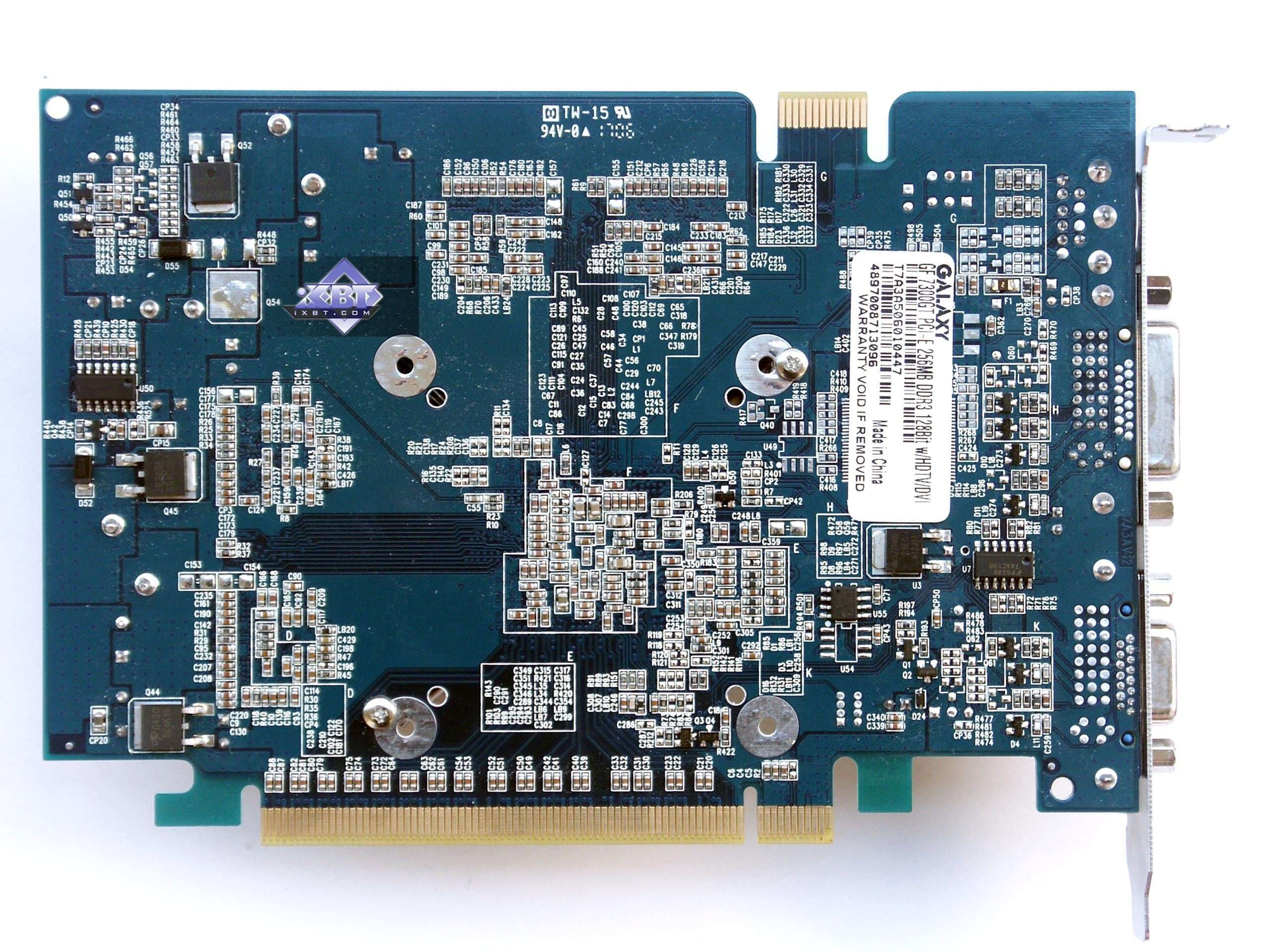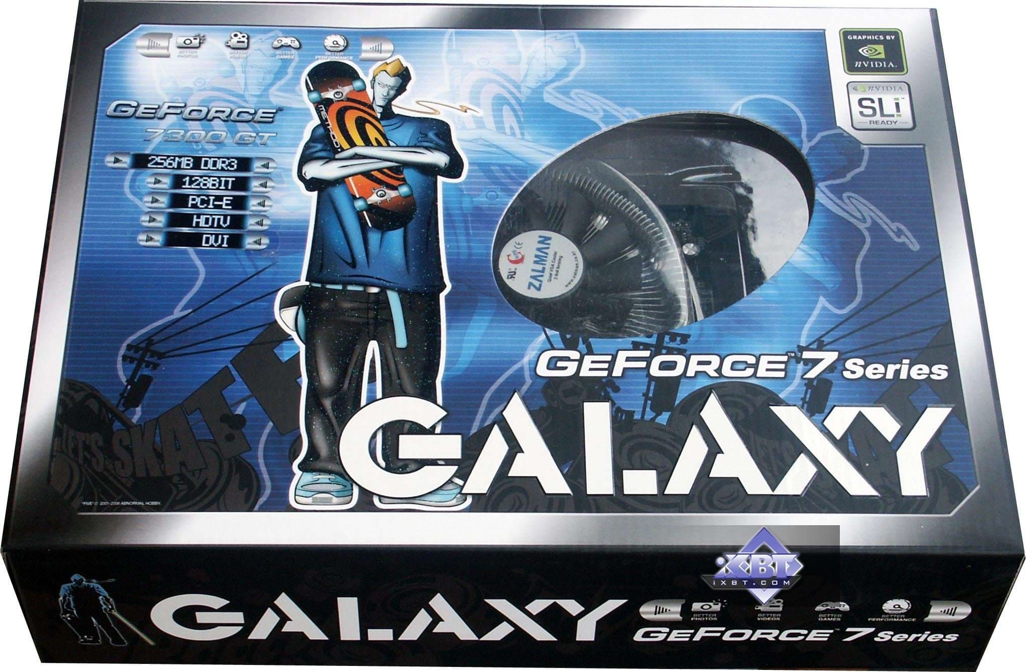 По иронии судьбы в качестве первого примера 7300 GT нам достался продукт Galaxy, который резко отличается по частотам от референс. Должен сразу отметить, что вариантов GeForce 7300 GT есть ДВА: оснащенных DDR2-памятью, и GDDR3. Подчеркну, что всегда при покупке таких карт НАДО СМОТРЕТЬ, какой памятью ОНИ ОСНАЩЕНЫ. Если DDR2, то вас ждут невысокие частоты в 350/666 МГц, а если GDDR3, то частоты по памяти могут достигать 700 (1400!!!) МГц, а по ядру до 500. Представляете себе? Карта с одним и тем же названием, а частоты отличаются, как небо и земля, как у 6600 и 6600 GT.