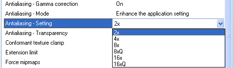 Дело в том, что режим, маркированный в панели управления как «8x» на самом деле не является тем режимом «8x», который доступен из некоторых «правильно написанных» приложений. Режим 8x в панели управления — это не MSAA, это CSAA. Доступный в настройках некоторых приложений MSAA 8x в панели управления почему-то носит название 8xQ.