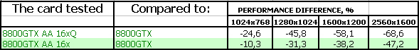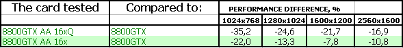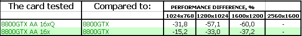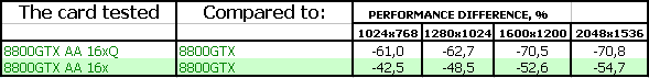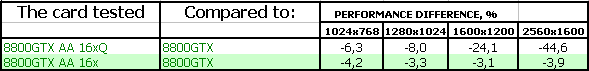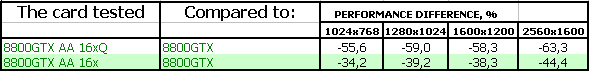 - Приятно осознавать, что для большинства современных приложений производительности даже самого качественного антиалиасинга GeForce 8800 GTX более чем достаточно. Но мы не можем не отметить довольно внушительные падения от включения антиалиасинга в процентном отношении — в будущем это может привести к невозможности использования высоких степеней AA на GF8800. Вопрос заключается в том, когда это самое будущее наступит.
