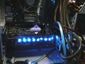 Тем не менее, внутри корпуса такая карта смотрится весьма эффектно, поскольку лампочки расположены не внизу (где обычно их ставят около лопастей вентилятора), а по боковому периметру, поэтому они прекрасно видны, и такое решение может понравиться любителям моддинга.