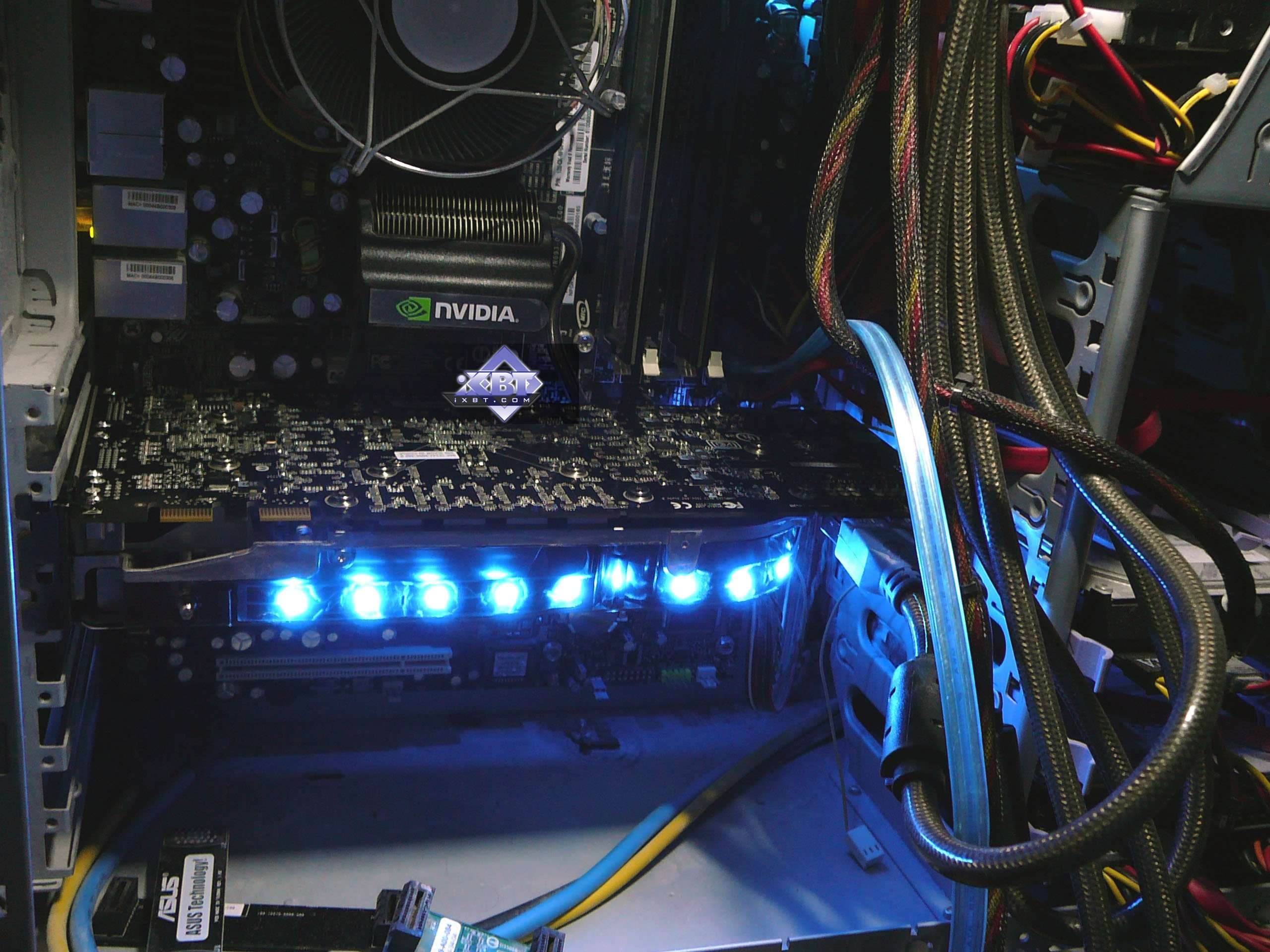 На фотографиях также четко видно, что GTX-плата требует ДВА шестипиновых PCI-E хвостов от БП.
