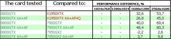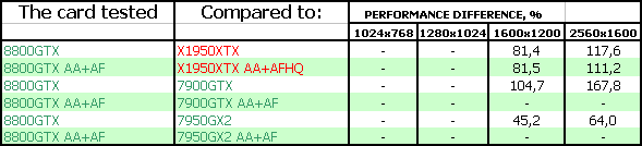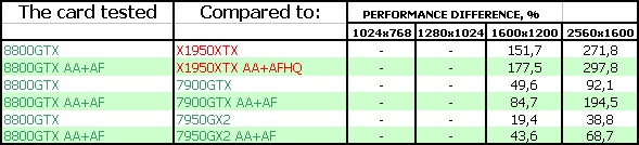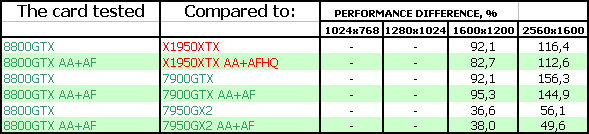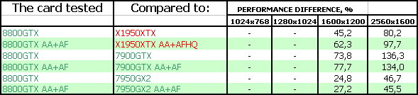 В данном тесте прекрасно видно, что в 2560х1600 все соперники 8800GTX из ранее выпущенных поколений резко сбавили по скоростям, уже точно упершись в свои возможности, и потому процент превосходства 8800 резко вырос.