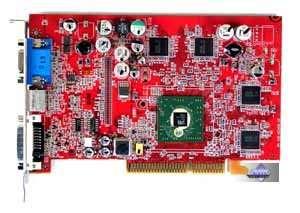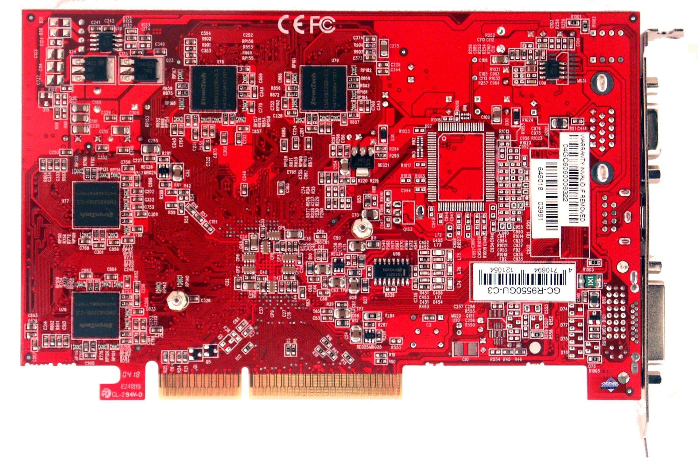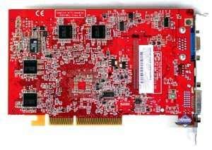 | Карта имеет интерфейс AGP x8/x4, 128 МБ памяти DDR SDRAM, размещенной в 8-ми микросхемах на лицевой и оборотной сторонах PCB. Микросхемы памяти EtronTech (BGA). Время выборки у микросхем памяти 3.3ns, что соответствует частоте работы 300 (600) МГц, память же работает на частоте 250 (500) МГц. Частота работы GPU 400 MHz. Шина обмена с памятью — 128 bit. Обратите внимание на повышенные частоты относительно обычного RADEON 9550 (250/200 (400) MHz). | ![]() |