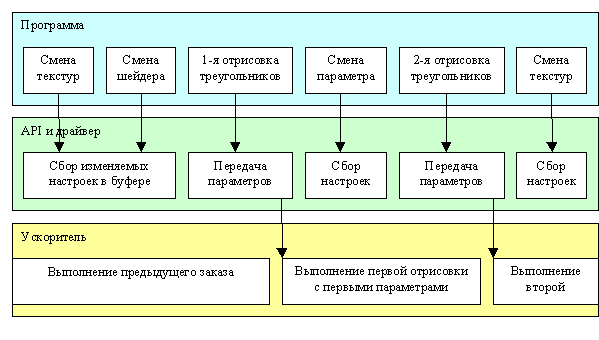Как мы видим на схеме программа достаточно часто вызывает API, меняя различные параметры (у современных приложений смена параметров сводится в основном к назначению новых текстур и шейдеров), а затем посылает на отрисовку буфер с геометрической информацией, которую и должен воспроизвести ускоритель с участием ранее заданных шейдеров и текстур. Однако каждый вызов API не передается современным ускорителям напрямую это было бы слишком расточительно. Различные настройки накапливаются драйвером в специальном буфере в системной памяти, и только когда наступает время рисовать что-либо с их использованием, ускорителю передается указатель на этот буфер с сохраненными там для него настройками (командами), кодом шейдеров и ссылками на геометрические данные которые надо нарисовать. Начиная с этого момента, ускоритель самостоятельно интерпретирует буфер, настраивая свои внутренние блоки, и самостоятельно выводит на экран фигуры по переданным ему геометрическим данным, так же постепенно выбирая геометрические данные из локально и/или системной памяти через системный интерфейс (часто геометрия находится в его локальной памяти, полностью или частично). Драйверы, разумеется, не ждут, пока ускоритель закончит эту работу, а сразу возвращают управление программе и продолжают собирать настройки и команды в новом буфере. Ожидание включается только в том случае, если новый запрос на отрисовку придет раньше, чем ускоритель успеет закончить предыдущий.