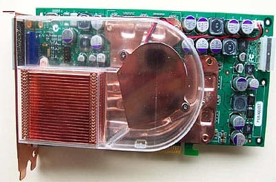 В наличии разъем для внешнего дополнительного питания, один DVI, один TV-Out и один VGA разъем. Два чипа Silicon Image отвечают за двуканальный (до 2048х1536) DVI интерфейс, чип Phillips за TV-Out. В GeForce FX и на этой карте использованы уже опробованое решение на базе внешних интерфейсных чипов это характерно для топовых продуктов NVIDIA. В последующих продуктах для ниши Mainstream TV-Out и DVI интерфейсы скорее всего будут интегрированны в чип. В наличии 8 микросхем DDR2 памяти SAMSUNG 128 Мбайт 128 бит, 1 ГГц эффективной частоты передачи данных. Интересно что микросхемы памяти расположены достаточно далеко от чипа видимо 128 бит шина и улучшенные интерфейсные характеристики DDR2 позволили сделать разводку более простой. Официальная тактовая частота чипа 500 МГц, в будущем вероятно появление разных (возможно и более быстрых) вариантов карт на основе GeForce FX. Как вариант может быть использовано решение с наружным забором или отводом воздуха, наподобие разработанной компанией Abit технологии: