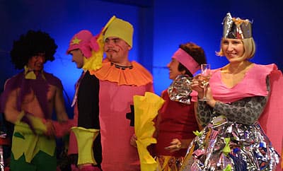 5:00pm Кинотеатр "Пять звезд". Прибывающих журналистов встречает персонал презентации в веселых техногенных париках: