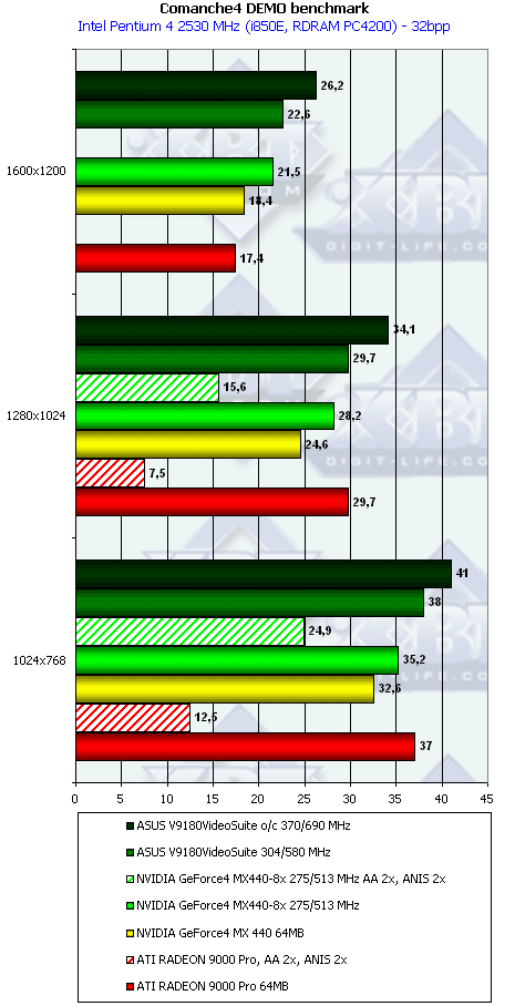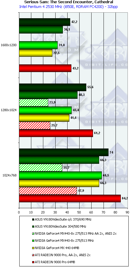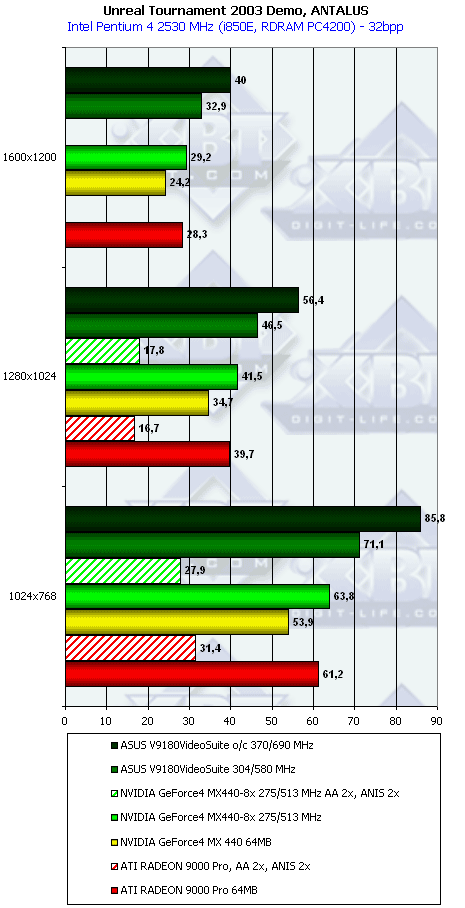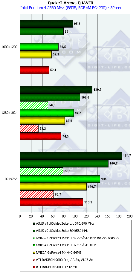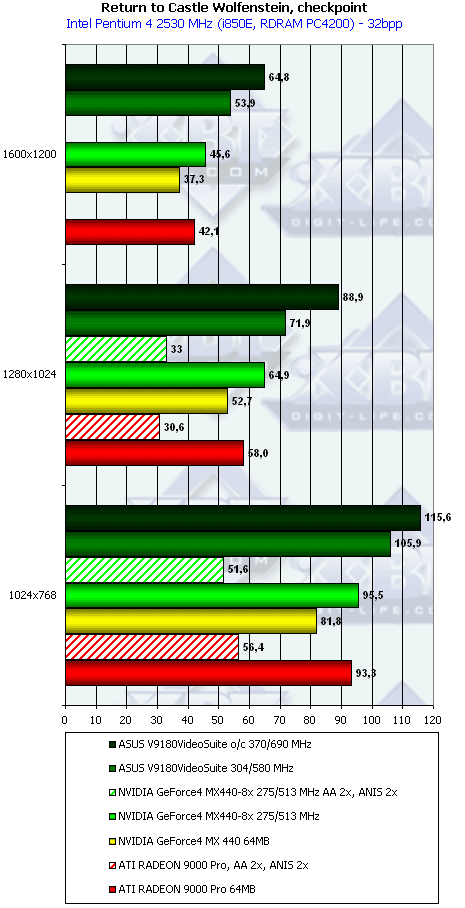 Мы видим, что более тщательно "вылизанный" OpenGL-драйвер от NVIDIA помог МХ400-8х одержать верх над RADEON 9000 Pro, однако при нагрузке АА и анизотропией перевес был на стороне продукта от АTI. Но более быстрая карта ASUS V9180 вне конкуренции.