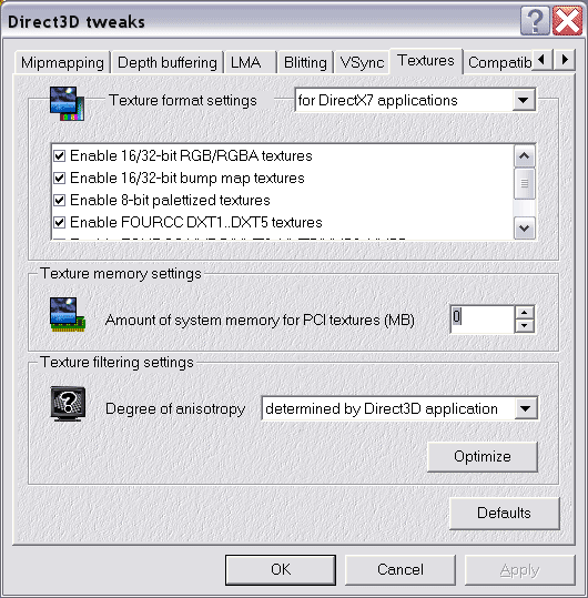 DirectX 8.0, Hardware TCL, мультитекстурирование, LOW Details, DXTC OFF, двойная буферизация,24-битный Z-буфер