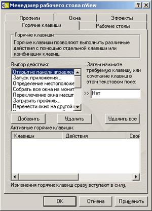 Для разных задач пользователем создаются отдельные профили. Дополнительно nView запоминает размещение приложений на экране, предлагает броузер рабочих столов Windows, реализует частичную прозрачность для перекрывающихся или перетаскиваемых окон, ускоряет развертывание окон и пр.