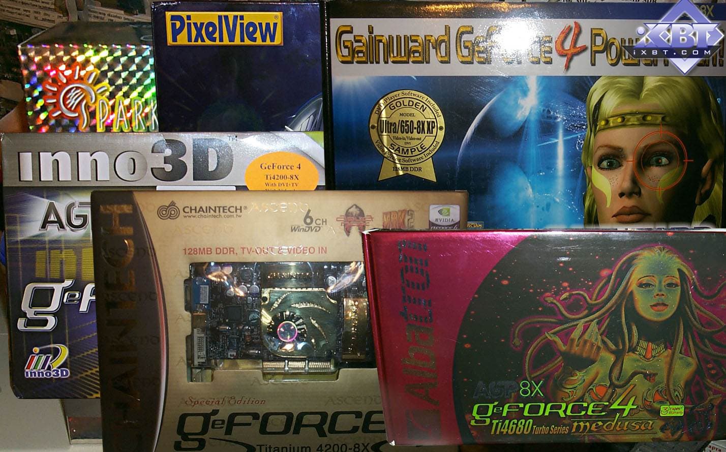 - Повышенные частоты у Albatron Medusa GeForce4 Ti 4680 Turbo, Gainward GeForce4 Powerpack Ultra/650-8X XP Golden Sample и Prolink PixelView GeForce4 Ti 4200-8x ;