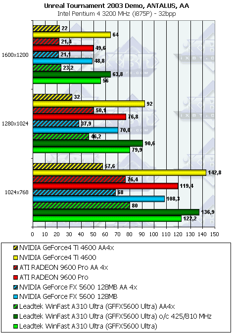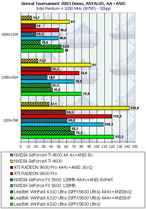 | Leadtek FX5600 U AA4x+ANIS8xQ | GF4 Ti 4600 AA 4x+ANIS 8x | 111,6 | 137,0 | 148,8 |
