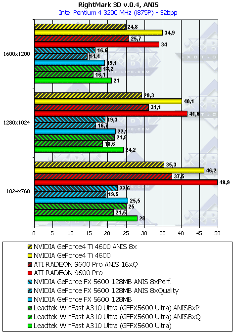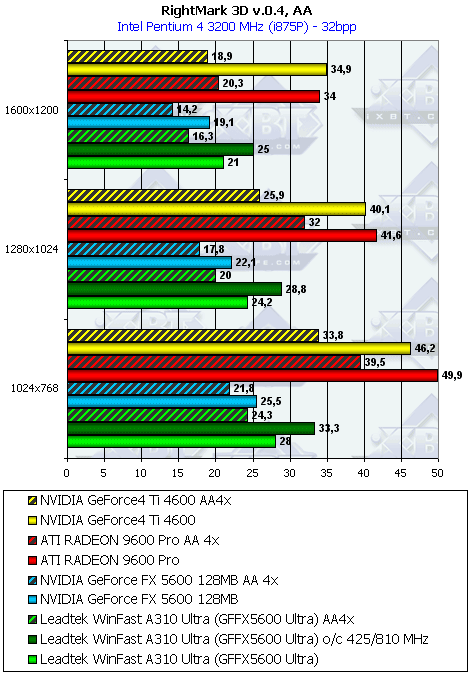 | Leadtek FX5600 U AA4x+ANIS8xP | GF4 Ti 4600 AA 4x+ANIS 8x | 52,9 | 51,4 | 47,9 |