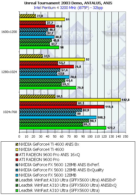 | Leadtek FX5600 U ANIS 8xP | GF4 Ti 4600 ANIS 8x | 94,3 | 98,2 | 100,9 |
