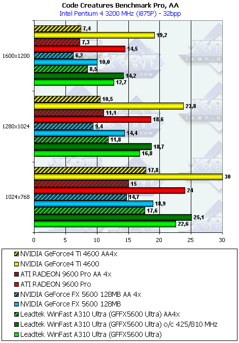 | Leadtek FX5600 U AA4x+ANIS8xQ | GF4 Ti 4600 AA 4x+ANIS 8x | 20,3 | 29,3 | 23,0 |